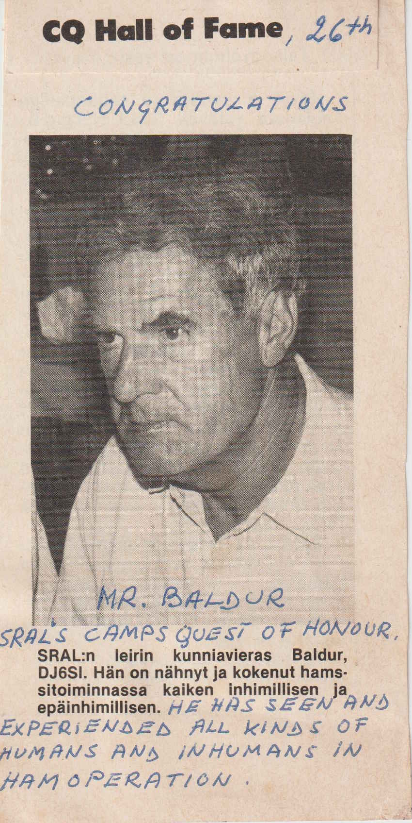 Honoury Speech Mister President, ladies and gentlemen. first i want to thank you for the honour to have been invited to your FOC-meeting, here in Asenburg.I beg to excuse our friend John A. Attaway. K4IIF, the Chairman of the CQ DX Awards Advisory Committee, who had planed to be with you today and present his speech personally. Unfortunately Business obligations kept him from coming. So he asked me as a member of the Cologne DX Group to read to you his presentation. Almost 20 years ago, the CQ Magazine DX Award's Advisory Committee decided that there should be a very special award for those few DX-minded radioamateurs who have made contributions to our hobby which are "far beyond the call of duty," and which were often made at great personal sacrifice of time and resources with no thought of personal gain or recognition. It was felt that the contributions to be recognized should be made over a long period of time, not just one major event never to be repeated. This special award would be called the DX HALL OF FAME. The Committee of 20 years ago recomended no rigid guidelines for membership in the DX Hall of Fame, it preferred to leave future Committees the flexibility to base their choices on a wide range of accomplishments. As a result, those elected to the Hall of Fame have included great Dxpedition Operators, leading QSL managers, DX writers and others who have given fully of themselves and their time for DX. The first person to be honoured by election to the DX Hall of Fame was Gus Browning, W4BPD, on Nov. 1. 1967. Those fellow "old-timers" among you may aqree that Gus is the greatest DXpedition operator of all time, having operated from over 100 rare countries. This was certainlythe perception of the Committee at that time. Among the 25 others honoured during the intervening years have been the following 5 Europeans: Marty Laine, 0H2BH. elected Jan. 22, 1972 Ernst Krenkel, RAEM, elected April 14. 1974 Geoff Watts, elected June 11. 1977 Eric Sjolund. SM0AGD. elected April 21, 1981 Franz Langner, DJ9ZB. Elected May 9, 1982 Today it is my very great pleasure to announce the election of a 6th European DXer- to the DX Hall of fame. I received letters nominating this man from individuals and groups on both sides of the Atlantic Ocean. Most prominent of these were the Northern California DX Club and the Cologne DX Group from the federal Republic of Germany. The man selected for this unique honour had made his mark as a DXpedition operator, having conducted over 30 DXpeditions to 20 different DXCC countries over the past 2 decades. He has been particularly active over the past 10 years. His DXpeditions have not been to those easy spots where you put a beam on the roof of the Hilton Hotel. As you will realize when I announce his name, this is a man who has put his own life in danger to put a rare QSL card on the wall of your ham shack. Without further Speech-making it is my own personal honour to announce the election of BALDUR DROBNICA, DJ6SI to the CQ DX Hall of Fame! John A. Attaway, K4IIF Chairman, CQ DX Award's Advisory Committee I want to add a few personal words. First let me congratulate Baldur to this great, honour. But let us not forget his wife Christa who must have had very much understanding for our hobby. I just want to remind you on the Spratley- accident when we all did not have any news for days and days. let us also remember our friends Gero Band, DJ3NG and Diethelm Müller, DJ4EI, who did not come back from their trip to Spratley. Baldur and Christa may I present to you now the plaque you have been awarded, and in doing so thanking you for the fine work you did on your many trips.